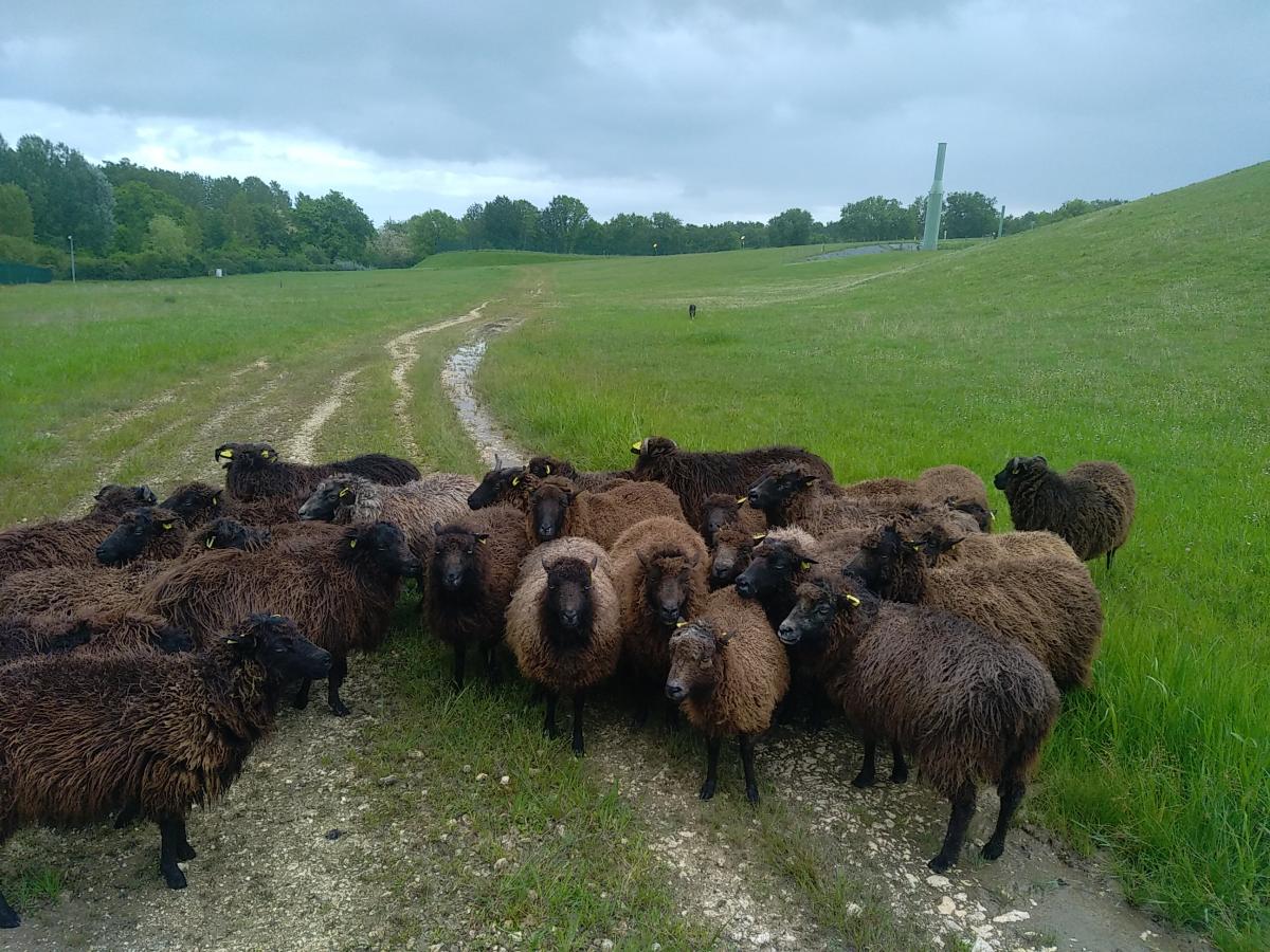 Sur un terrain dense et végétalisé, huit moutons s’affairent à l’année pour nettoyer et maitriser la pousse de la mauvaise herbe.